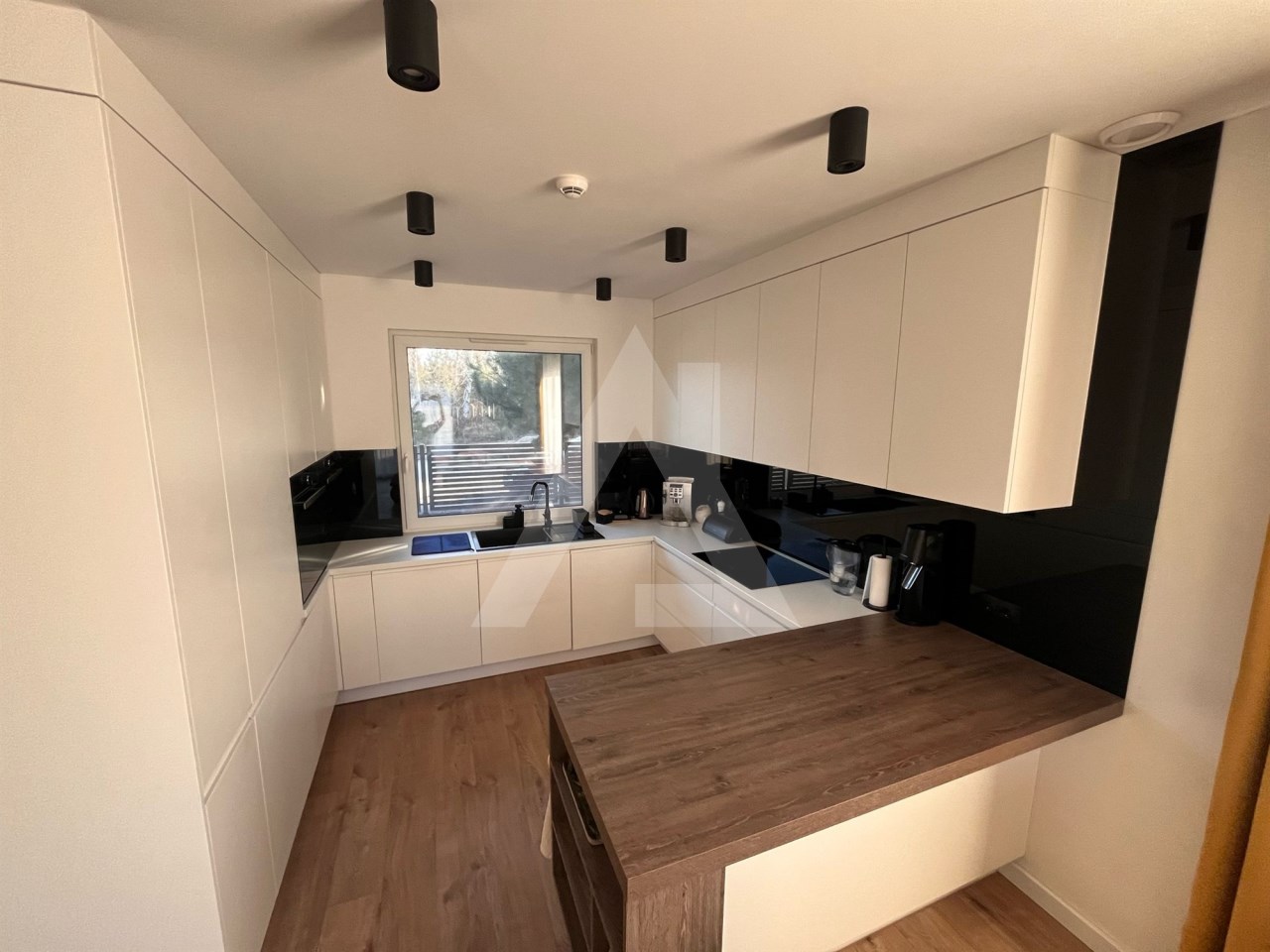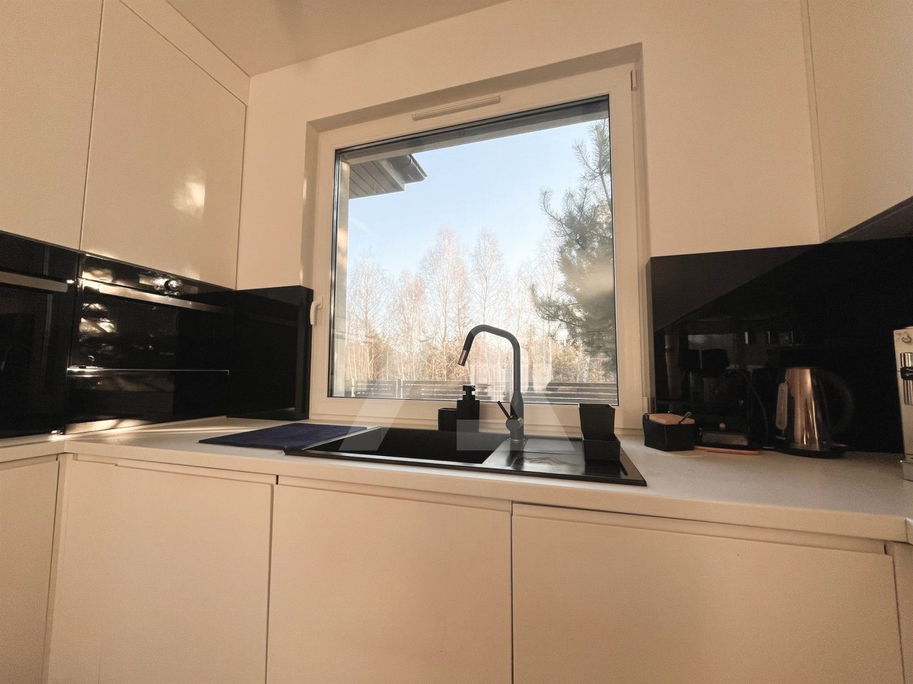 Okna PCV, kuchnia wykonana na wymiar w nowoczesnej zabudowie stolarskiej w miłym dla oka odcieniu, wyposażona w wysokiej klasy sprzęty AGD.