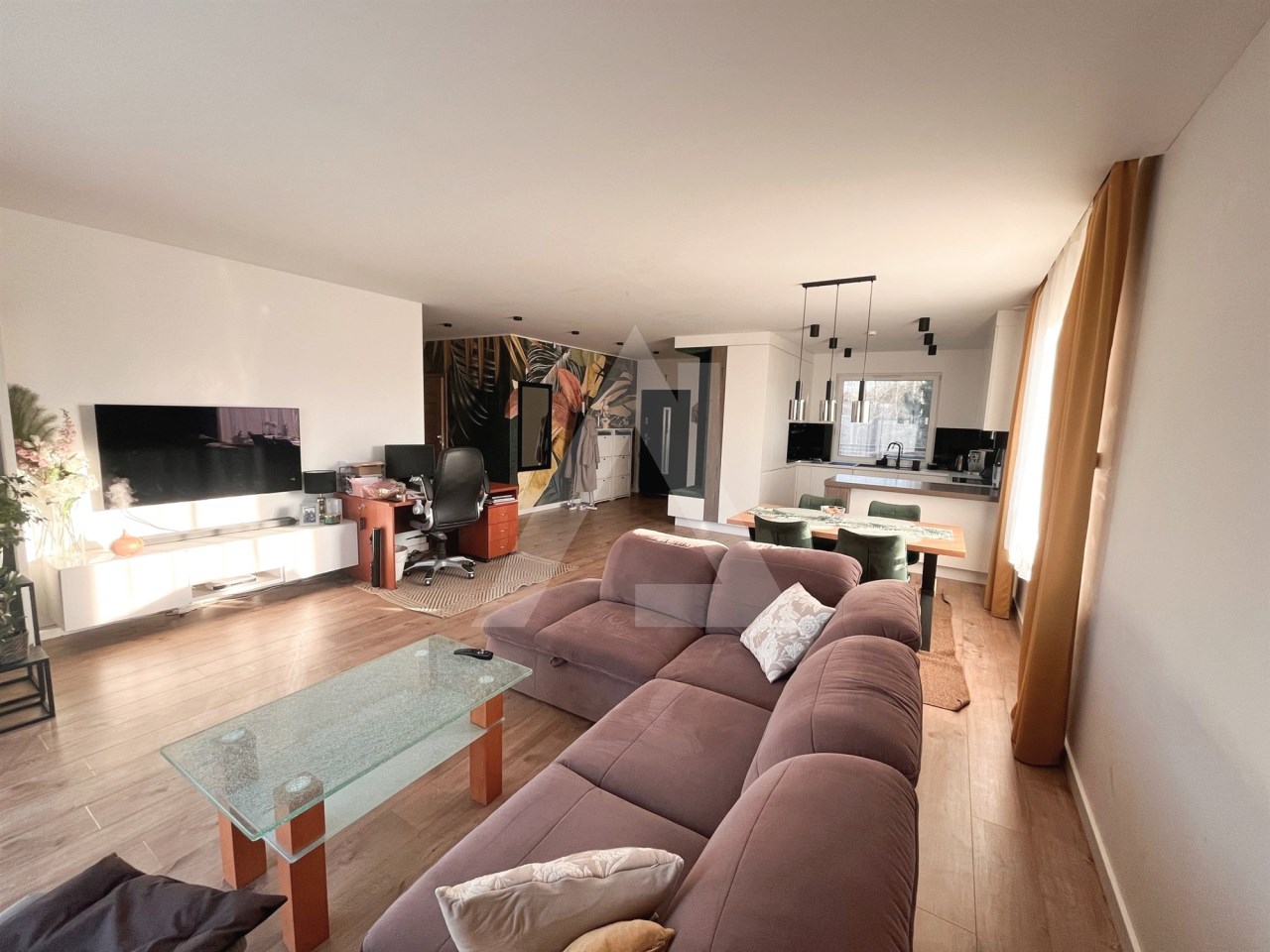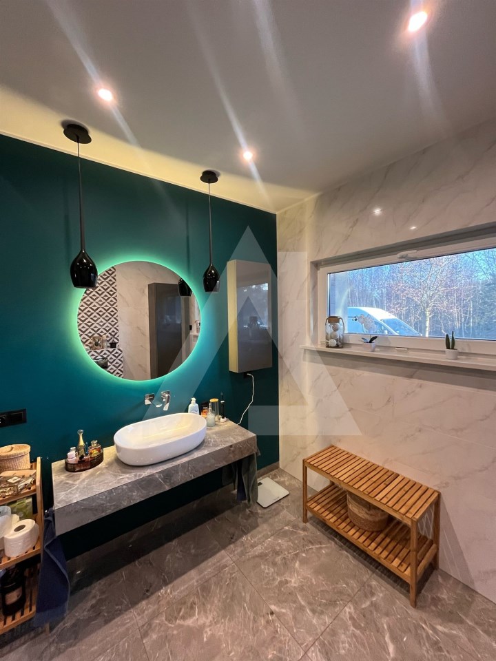 Wnętrze domu składa się z przestronnego salonu z dużym aneksem kuchennym pięknie doświetlonego o metrażu: ok 47 mkw.