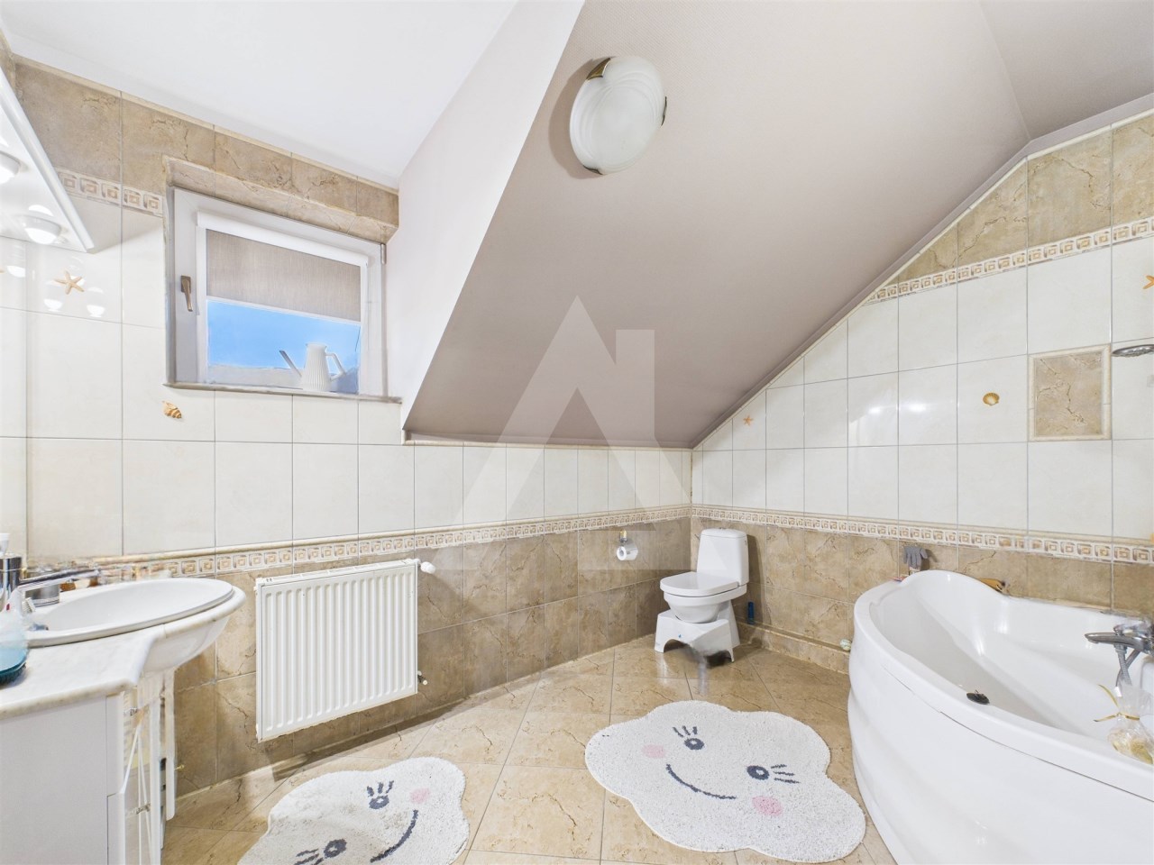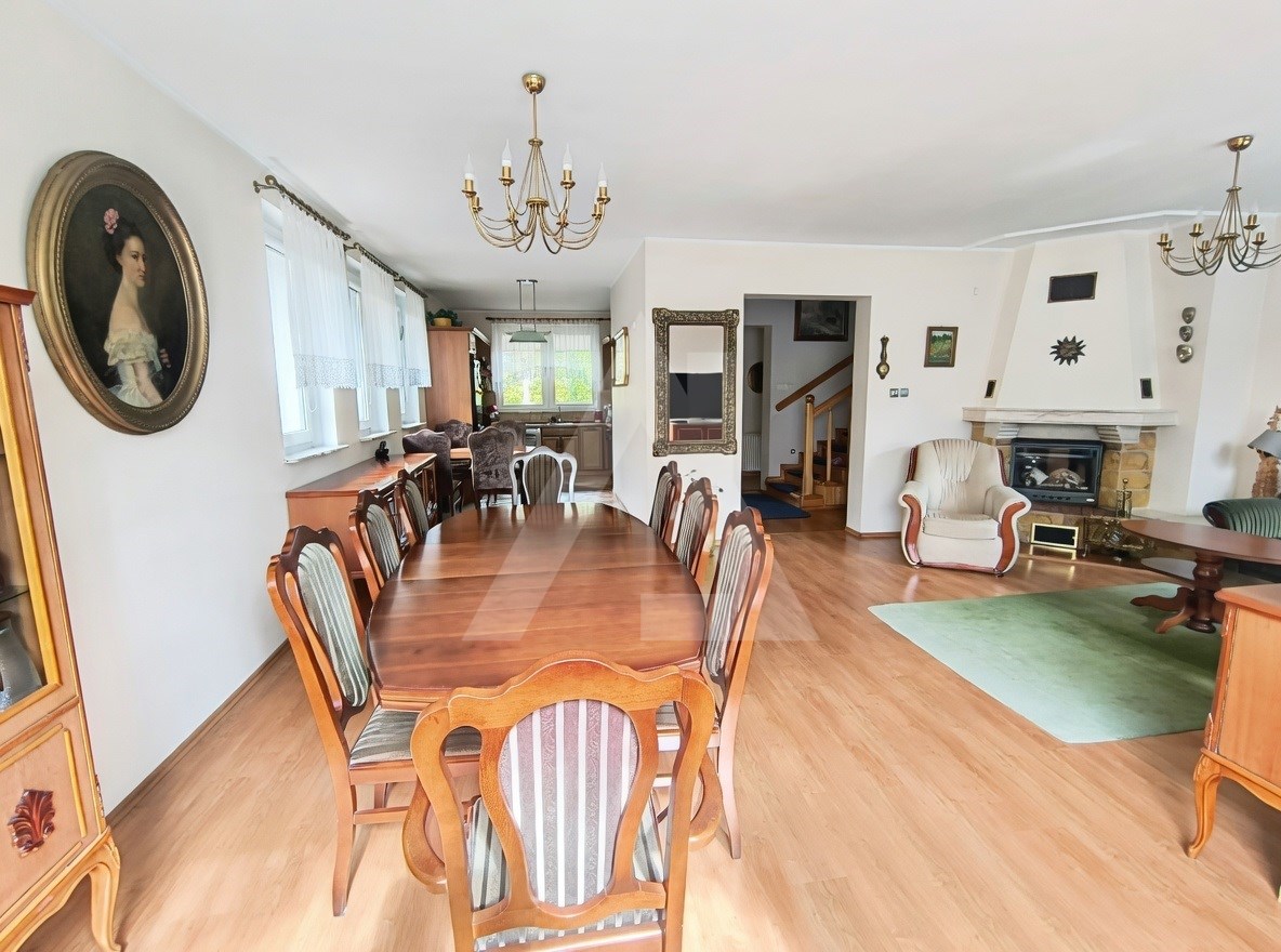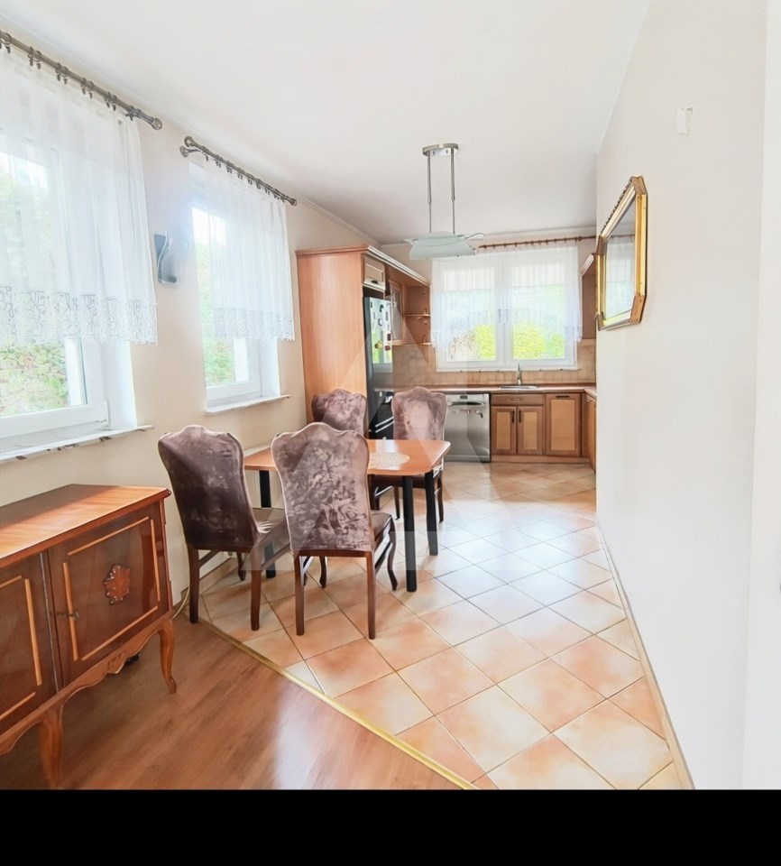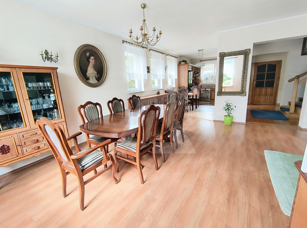 Do ogłoszenia dołączone są zdjęcia wnętrza, ogrodu oraz szczegółowy rzut nieruchomości. Zdjęcia pokoi na półpiętrze oraz piętrze zostały opróżnione z mebli przy pomocy AI.