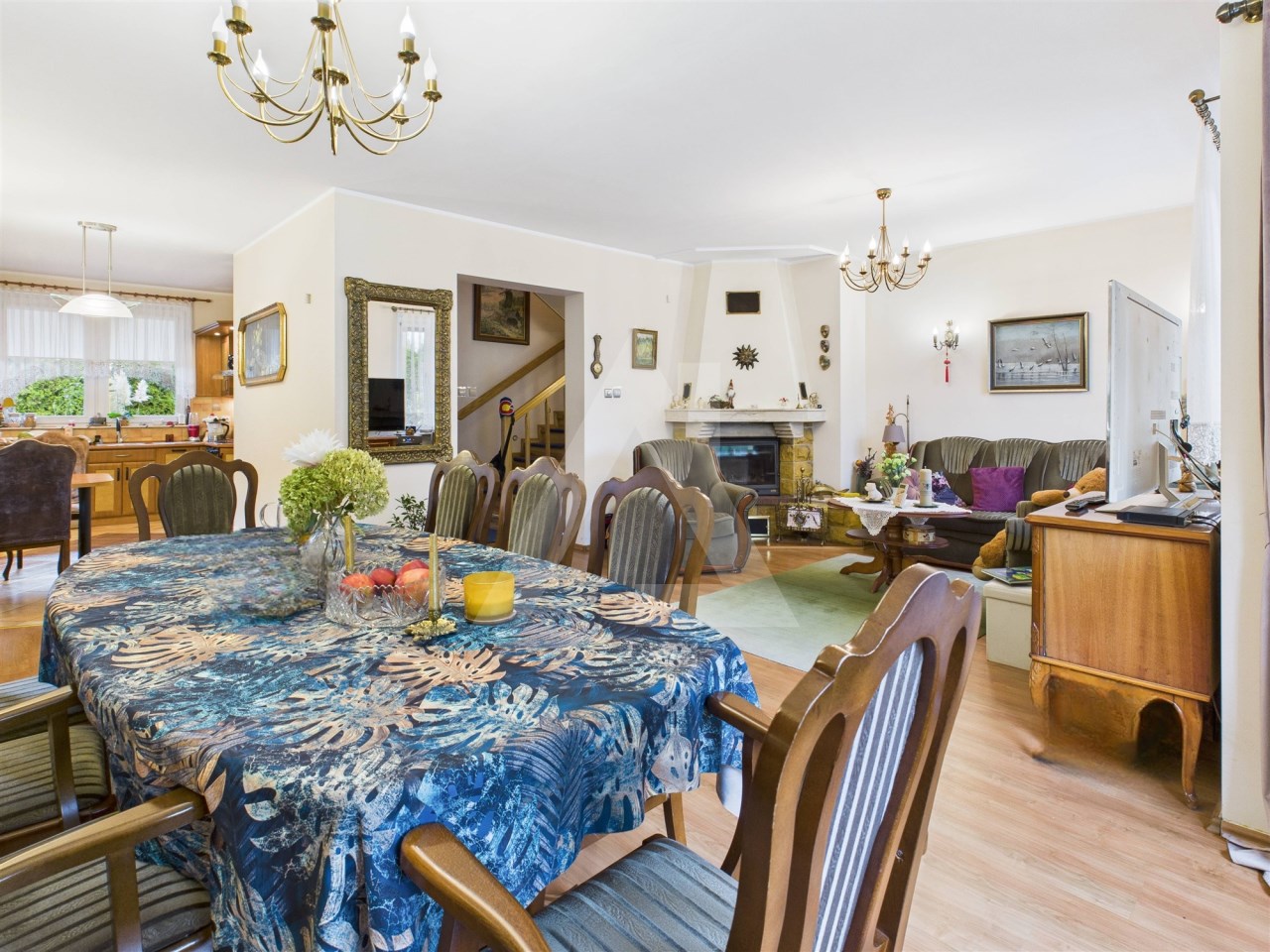 Do ogłoszenia dołączone są zdjęcia wnętrza, ogrodu oraz szczegółowy rzut nieruchomości. Zdjęcia pokoi na półpiętrze oraz piętrze zostały opróżnione z mebli przy pomocy AI.