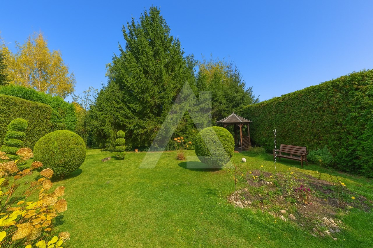 Ogród zaplanowano tak, by zapewniał maksimum prywatności i funkcjonalności – znajdziesz tu zarówno strefę rekreacyjną, miejsce na ognisko czy basen, jak i altanę z ławką wśród zieleni.