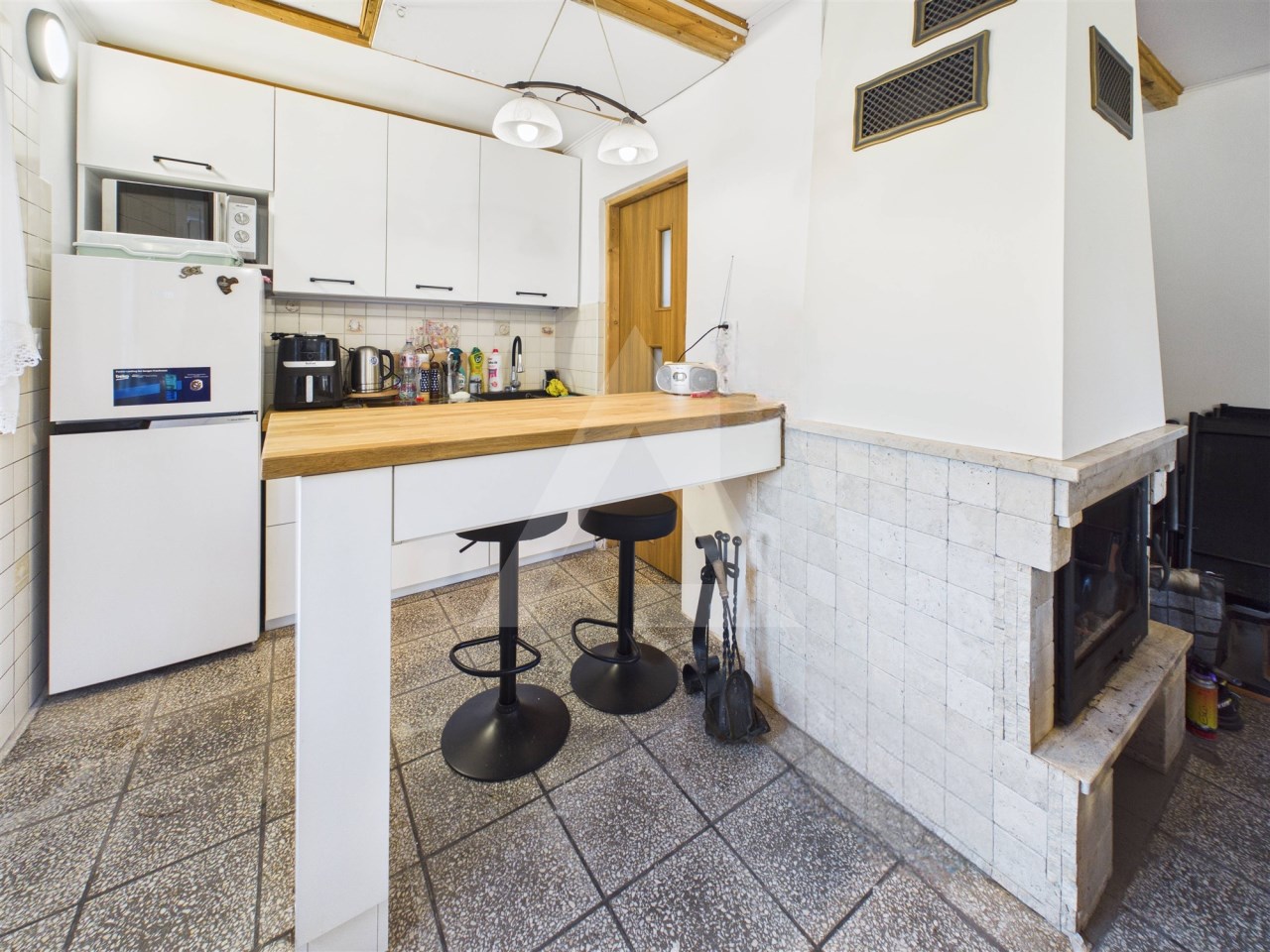 Nieruchomość jest gotowa do zamieszkania od zaraz i sprzedawana wraz z wyposażeniem. W salonie znajduje się kominek z rozprowadzeniem ciepła, który stanowi główne źródło ogrzewania. Wnętrze jest funkcjonalnie urządzone – w salonie znajduje się kanapa, stoły oraz krzesła, a kuchnia jest w pełni wyposażona w zabudowę kuchenną, kuchenkę, lodówkę, zlew, bojler elektryczny oraz mikrofalówkę. W łazience znajduje się kabina prysznicowa oraz pralka.