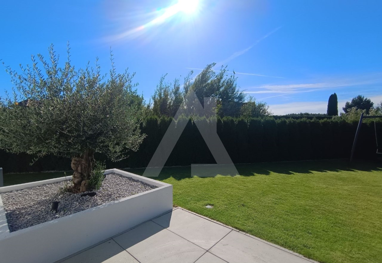 Na posesji o powierzchni 1255 m² urządzono elegancki ogród w stylu minimalistycznym, w którym dominują czyste linie i nowoczesne rozwiązania: