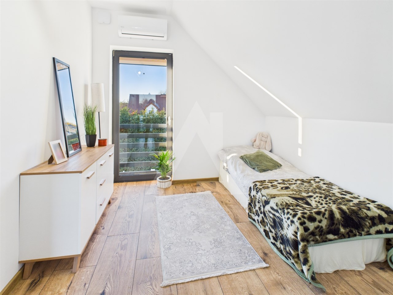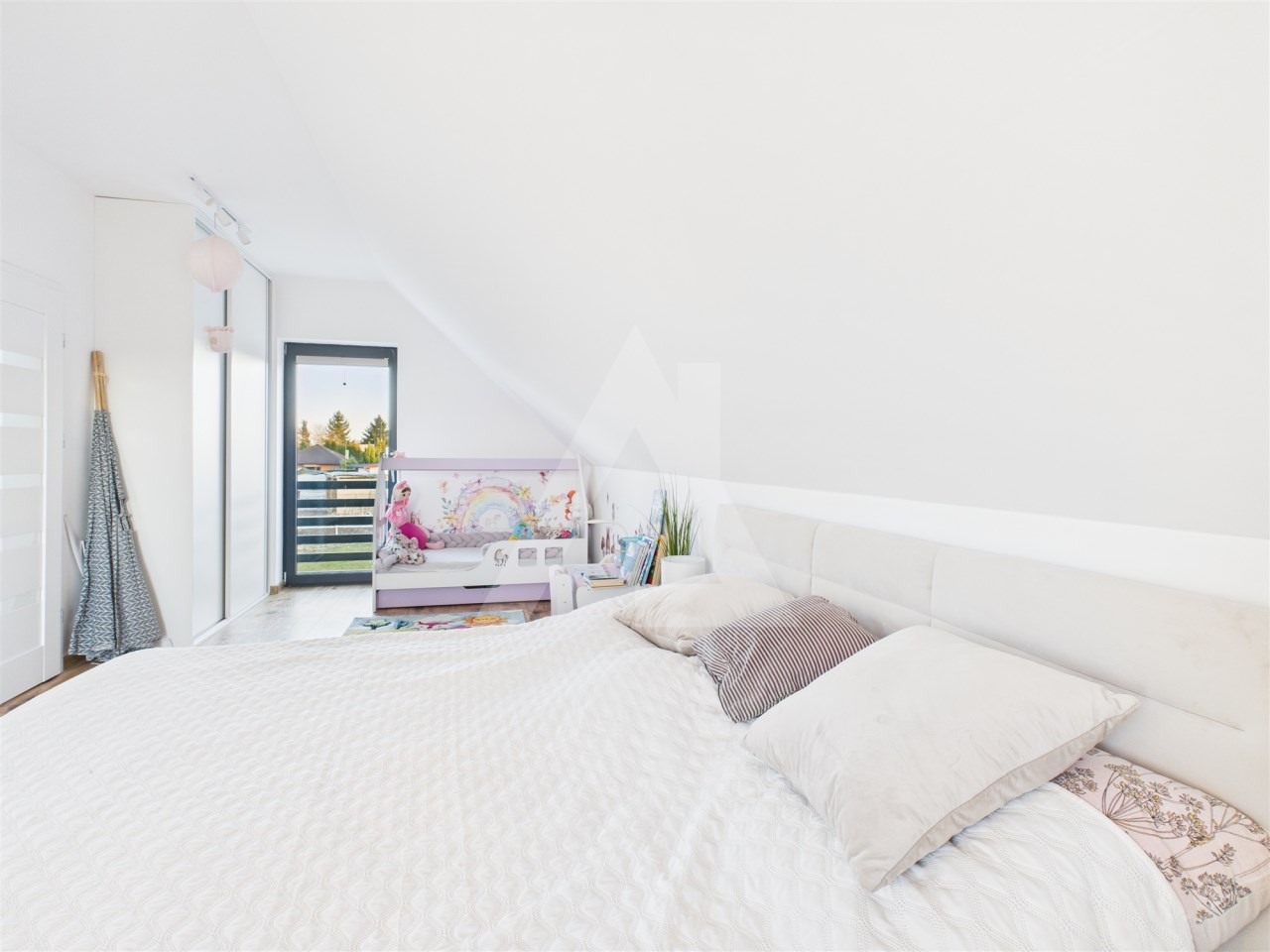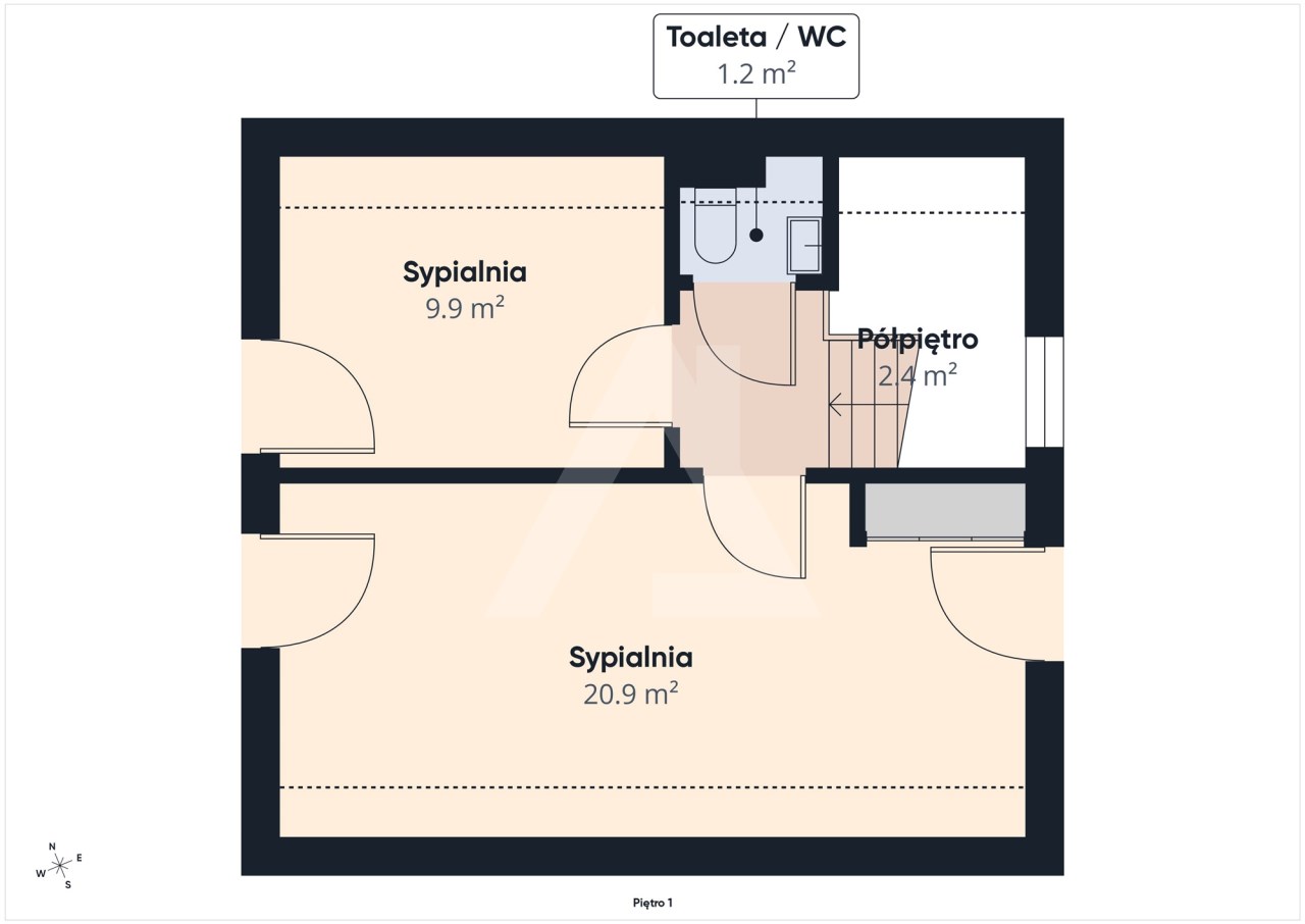 Na piętrze znajdują się dwie komfortowe sypialnie (w tym jedna podwójna) oraz dodatkowa toaleta.