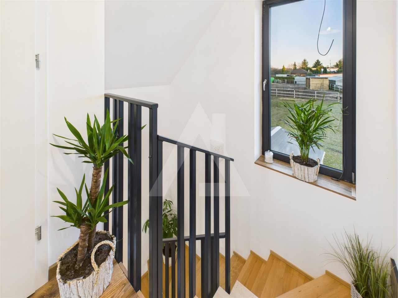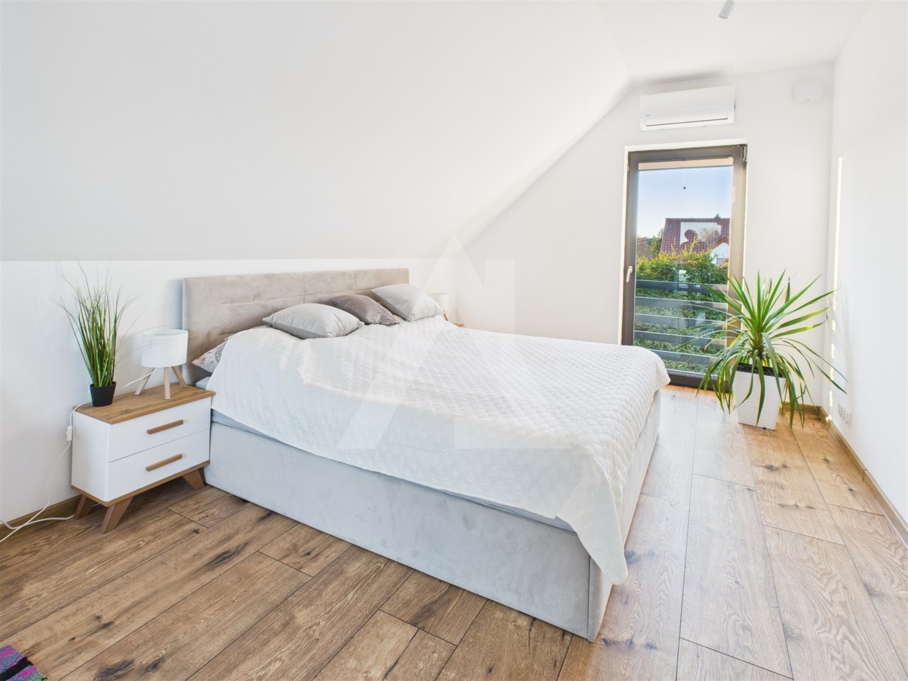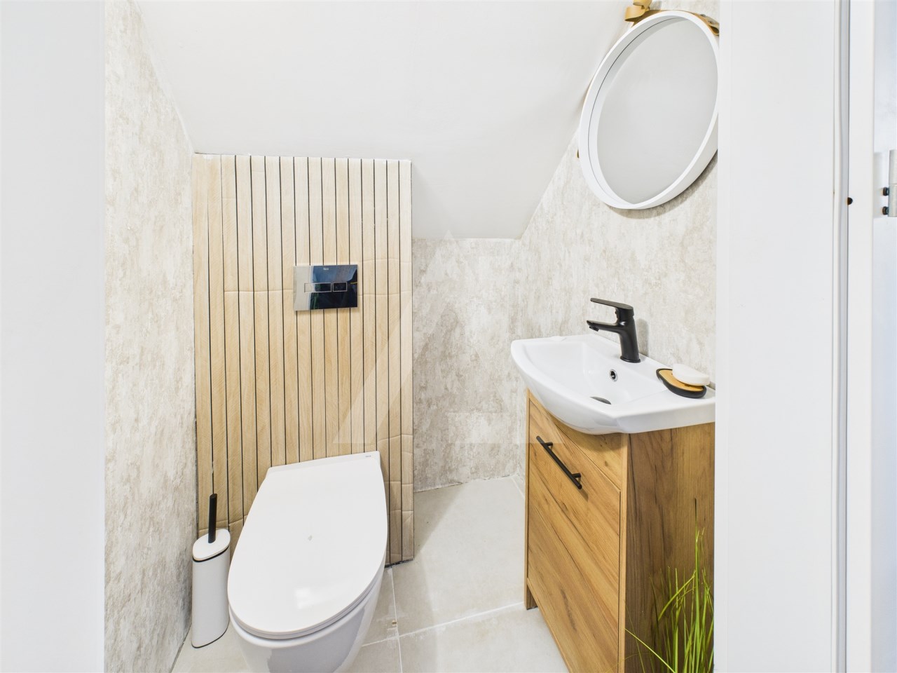 Na piętrze znajdują się dwie komfortowe sypialnie (w tym jedna podwójna) oraz dodatkowa toaleta.