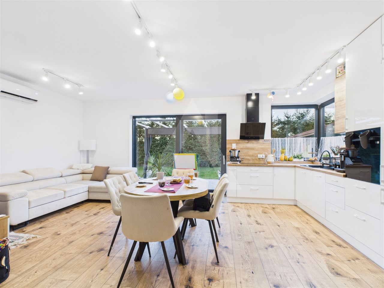 (kuchnia na wymiar – akryl; przestrzeń doskonale doświetlona dużymi przeszkleniami, wyjście na taras)
