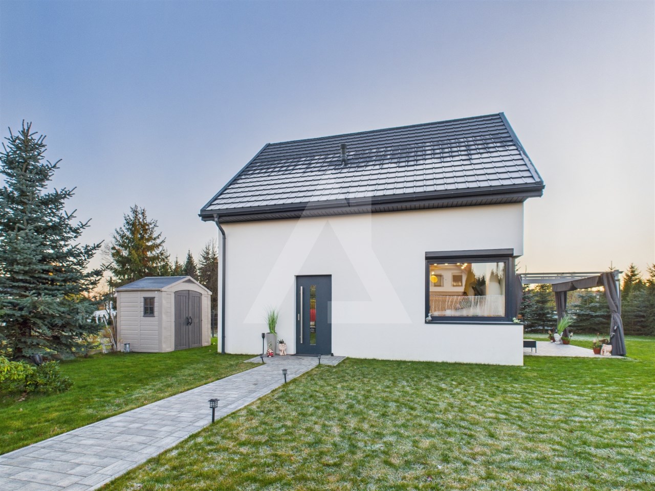 Działka jest w pełni ogrodzona, zamknięta bramą przesuwną, gustownie zagospodarowana: liczne nasadzenia (tuje, świerki, krzewy i kwiaty), altana 4 × 4 m, a także nowy domek narzędziowy.
