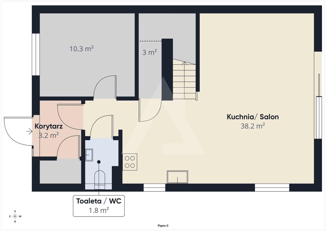 Parter: gabinet, toaleta, przestronny salon z wyjściem na taras, aneks kuchenny.
