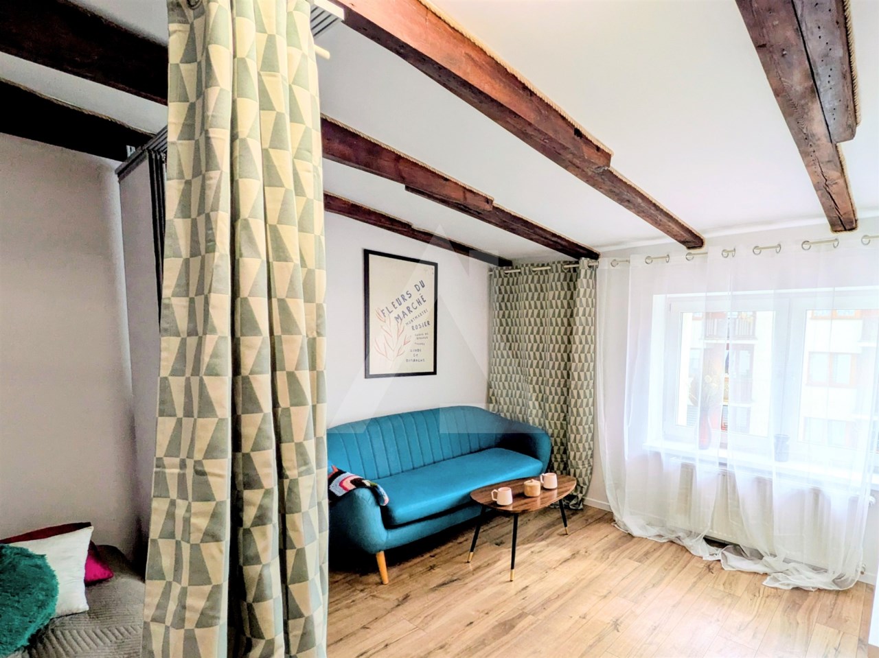 Mieszkanie łączy klimat starej kamienicy z nowoczesnym, ciepłym wykończeniem – charakterystyczne ciemne belkowanie na suficie, dużo światła i bardzo funkcjonalny układ.