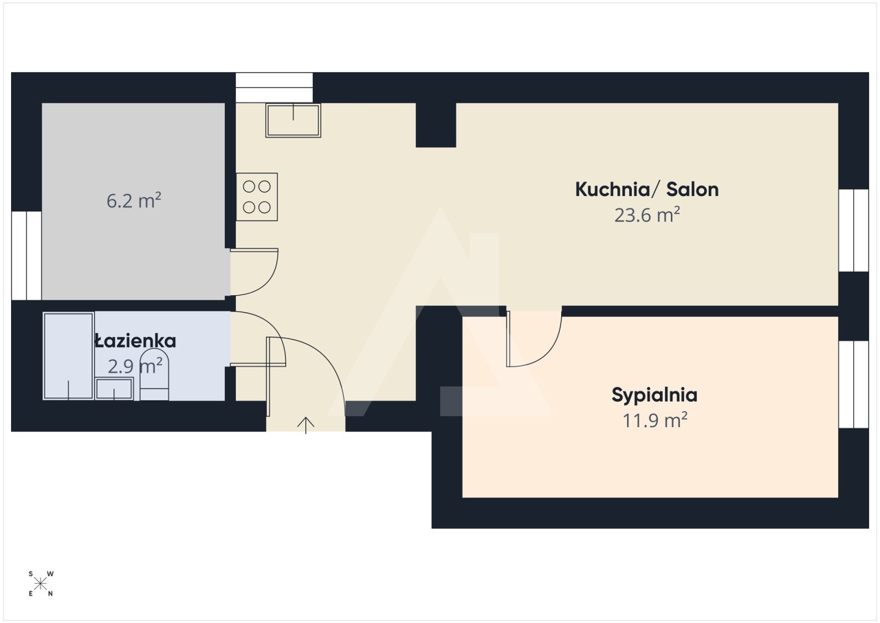 - Układ 3 pokoi – 2 sypialnie, salon z aneksem kuchennym