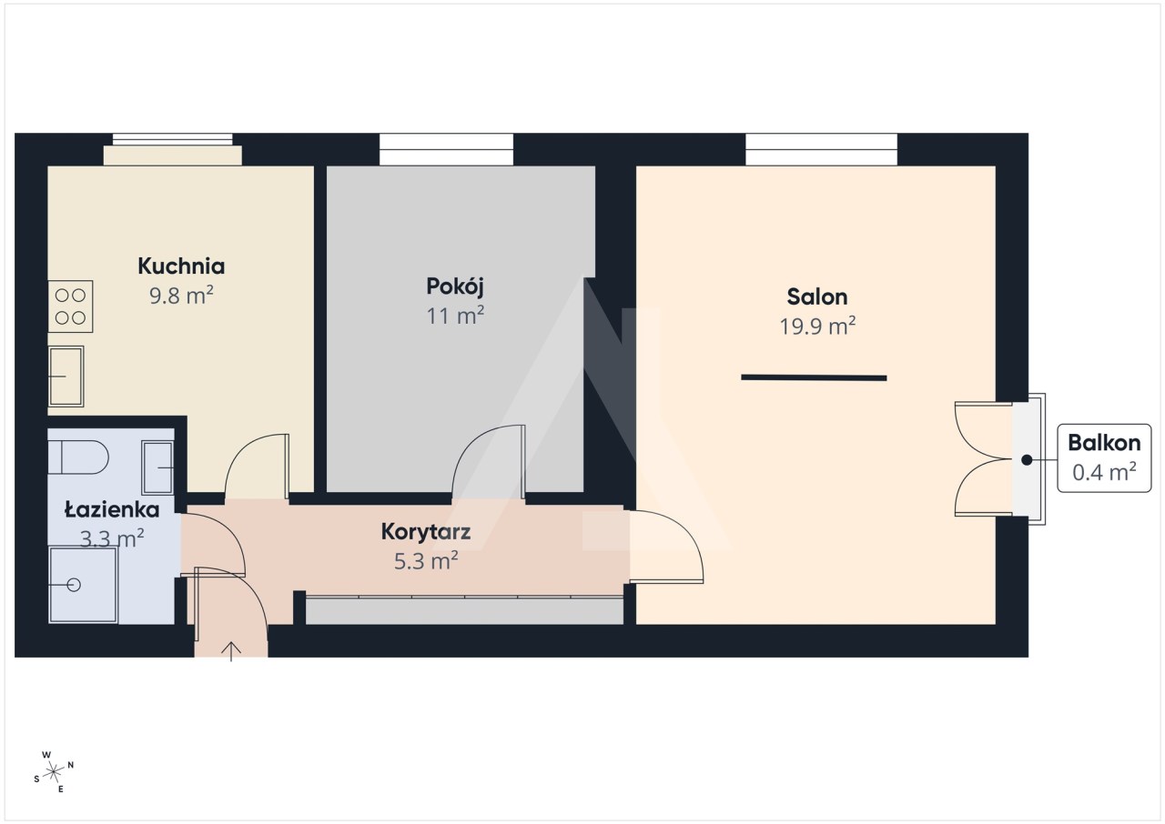 Mieszkanie składa się z przestronnego salonu, oddzielnej sypialni, osobnej kuchni, łazienki z WC oraz przedpokoju. Układ jest klasyczny i bardzo funkcjonalny, co daje szerokie możliwości aranżacyjne.