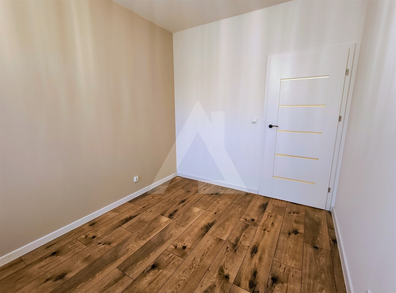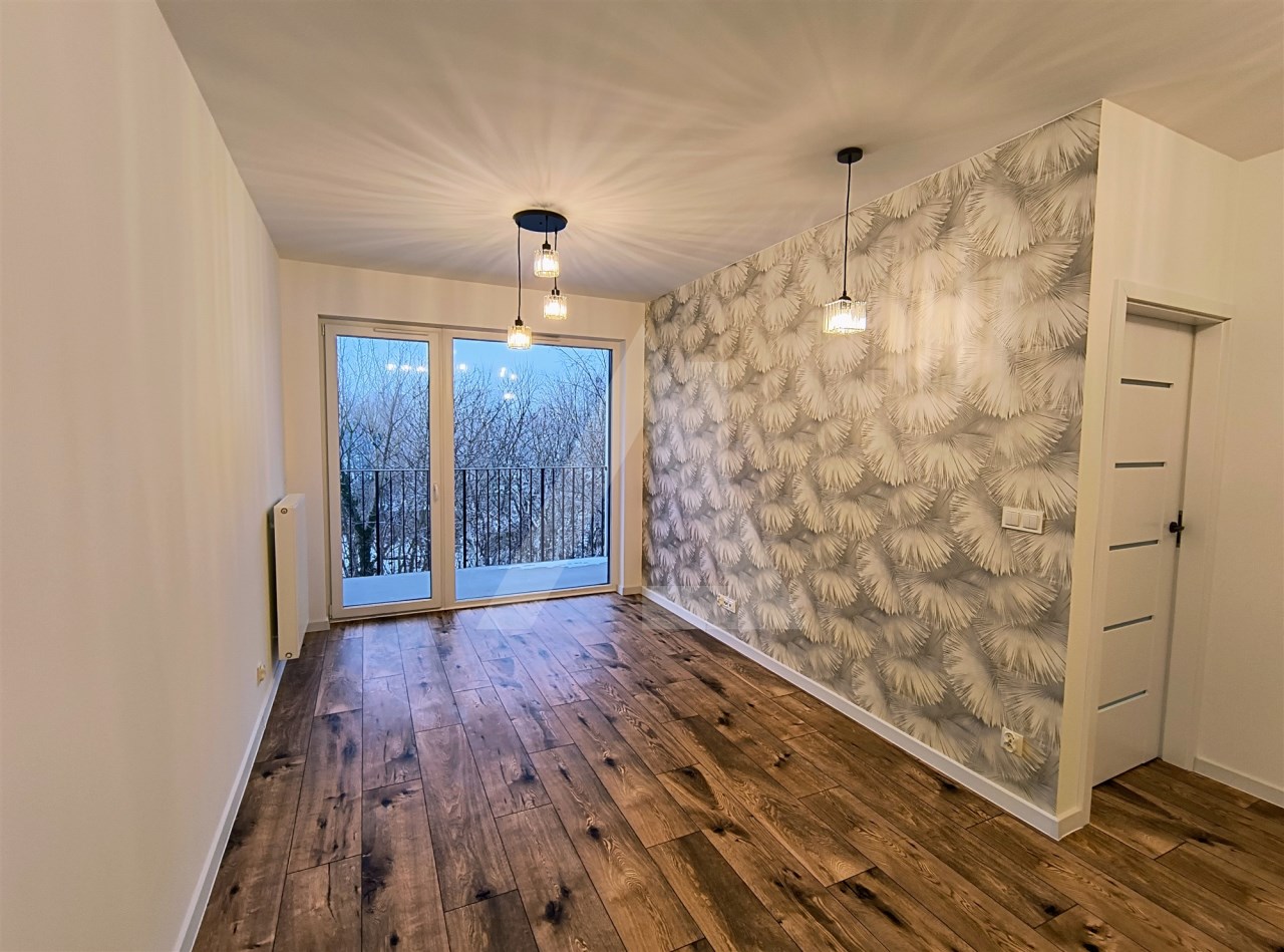 Mieszkanie wykończone w wysokim standardzie: estetyczne drzwi i ościeżnice, starannie dobrane materiały, spójna kolorystyka oraz dekoracyjna tapeta nadająca wnętrzu charakteru.