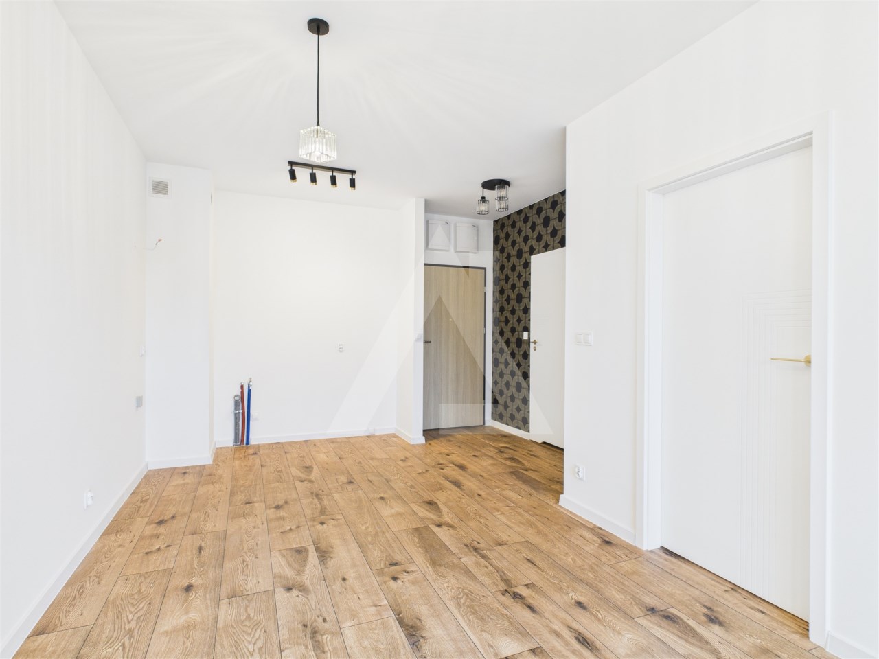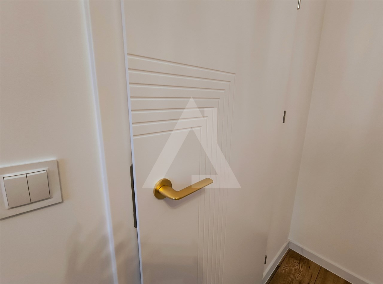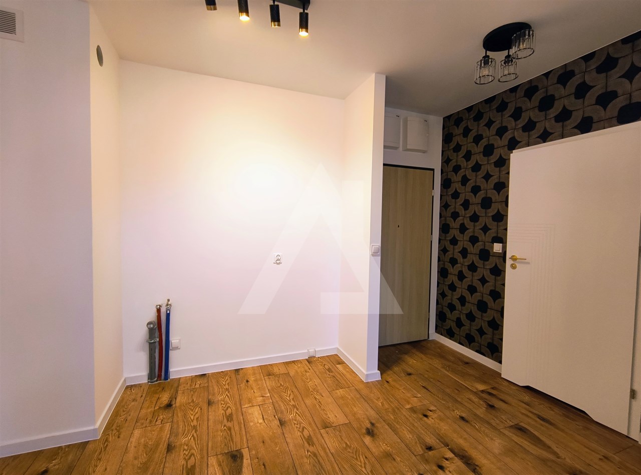 Mieszkanie wykończone w wysokim standardzie: estetyczne drzwi i ościeżnice, starannie dobrane materiały, spójna kolorystyka oraz dekoracyjna tapeta nadająca wnętrzu charakteru.