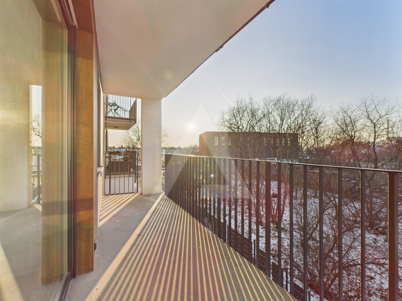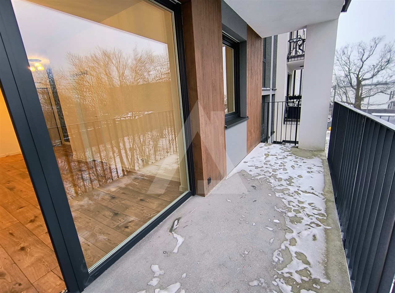 Loggia ładnie odsłonięta od sąsiadów, widok na zieleń, komfort i prywatność.