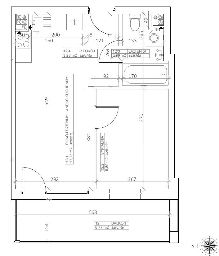 - Salon z aneksem kuchennym: 17,77 mkw